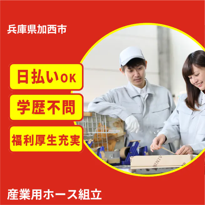 ※実際と異なるケースもございます。 交通費 支給あり 応募の流れ 本ページ内<応募する>ボタンより、必要項目をご入力の上、ご応募ください。 勤務地 【勤務地】兵庫県加西市朝妻町 勤務時間 【勤務地】①08:30~17:30 休憩60分