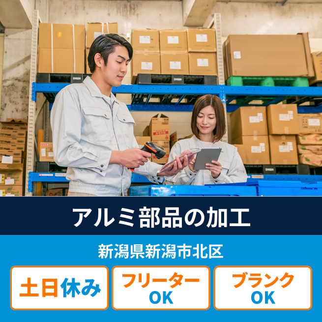 給与詳細 月収例 220,000円 時給例 1,130円 勤務地 新潟県新潟市北区 仕事内容 【輸送機器部品(アルミ製品)の加工・検査のお仕事です】