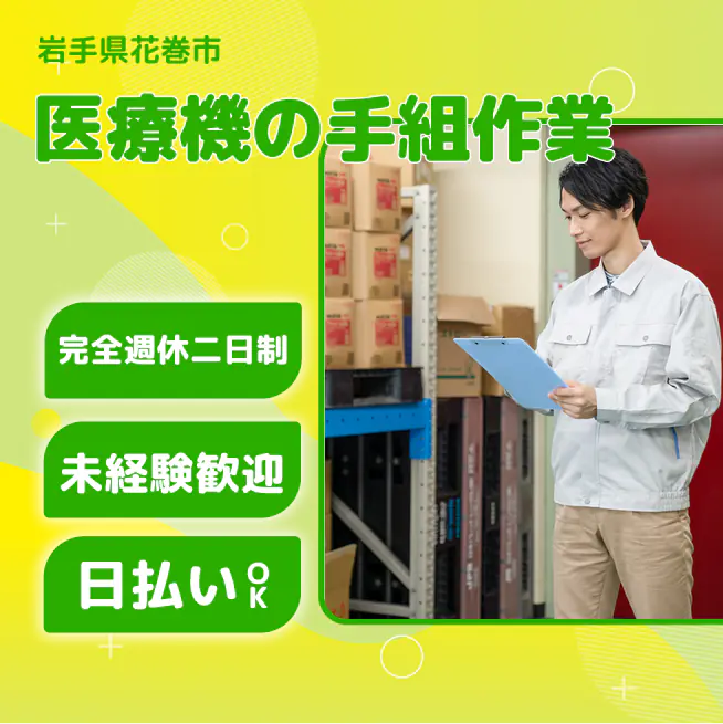 ※実際と異なるケースもございます。 交通費 支給あり 応募の流れ 本ページ内<応募する>ボタンより、必要項目をご入力の上、ご応募ください。 勤務地 【勤務地】岩手県花巻市北湯口第2地割 勤務時間 【勤務地】①08:30~17:10 休憩60分