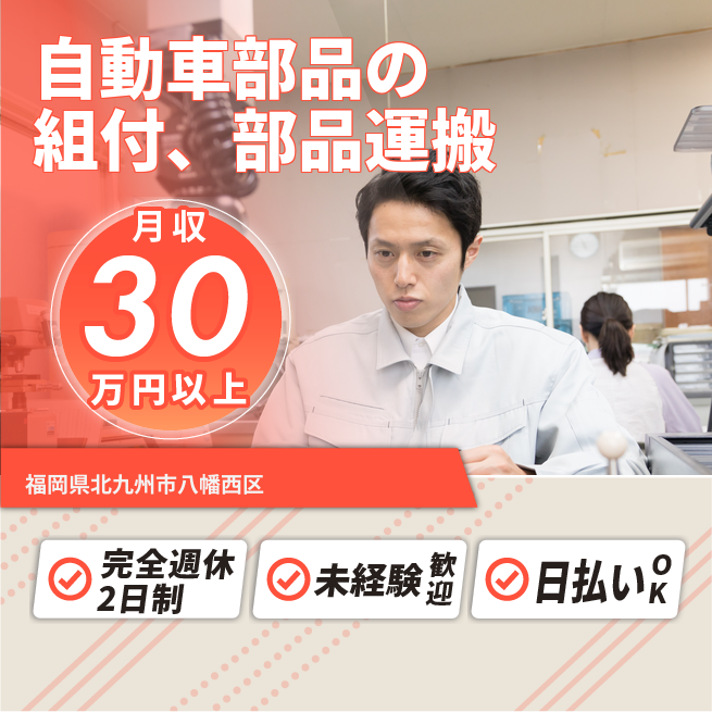 給与詳細 月収例 300,000円 日給例 12,000円 勤務地 福岡県北九州市八幡西区 仕事内容 製造ラインにて自動車部品組付、検査、部品運搬作業