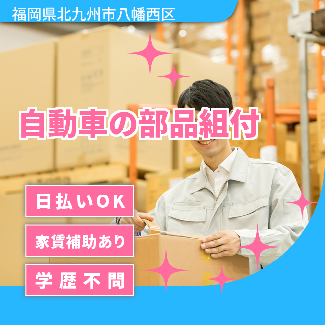 給与詳細 月収例 260,000円 日給例 10,400円 勤務地 福岡県北九州市八幡西区 仕事内容 製造ラインにて自動車部品組付、検査、部品運搬作業