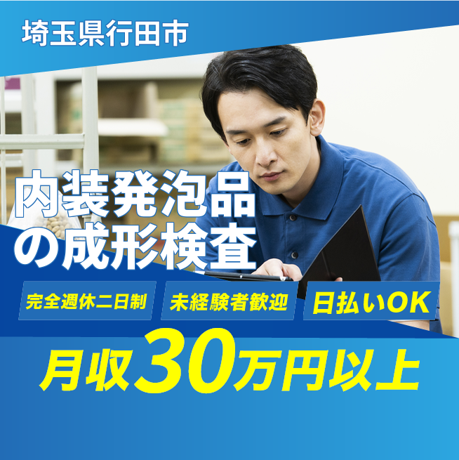 給与詳細 月収例 303,000円 日給例 11,600円 勤務地 埼玉県行田市 仕事内容 【自動車内装製品の樹脂発泡品やフロアカーペット等の製造・検査・梱包及びその他付帯業務】