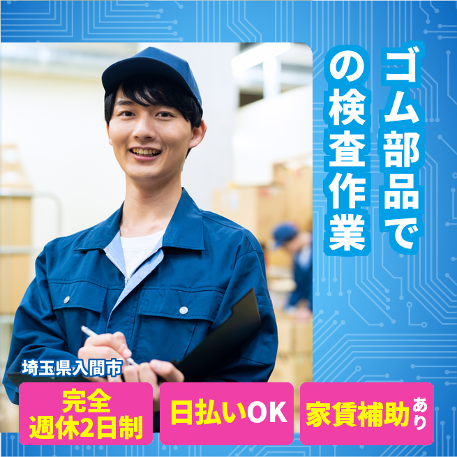 給与詳細 月収例 235,000円 時給例 1,150円 勤務地 埼玉県入間市 仕事内容 【ゴム製品の検査業務及び他付帯業務】
