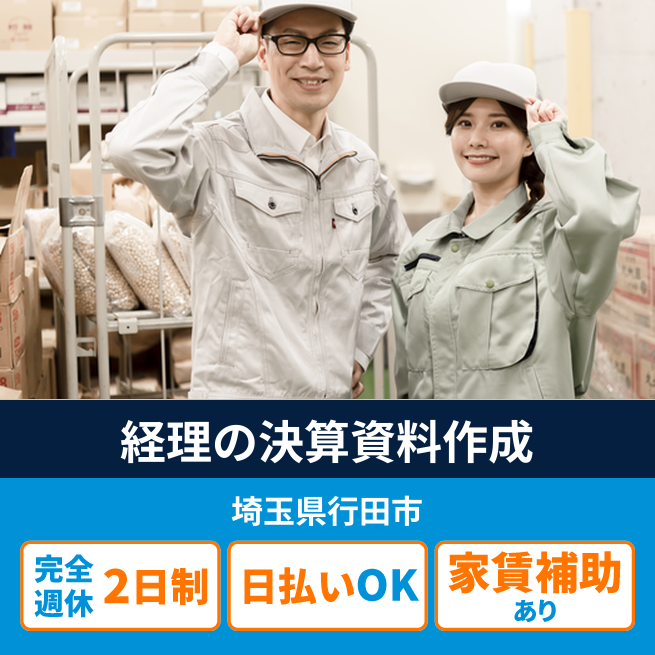 給与詳細 月収例 213,000円 日給例 10,000円 勤務地 埼玉県行田市 仕事内容 【業務内容】