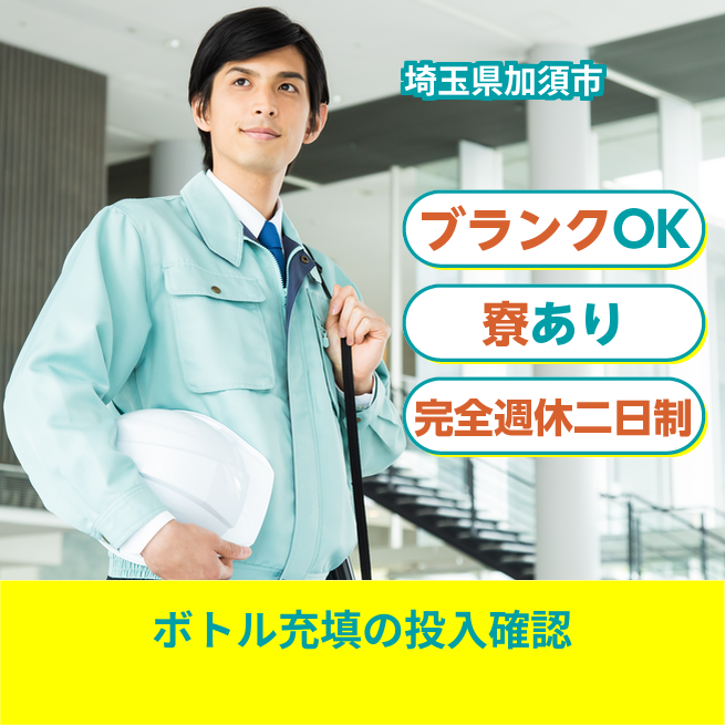 給与詳細 月収例 254,000円 日給例 11,200円 勤務地 埼玉県加須市 仕事内容 【充填機へ医療用プラスチックボトルの投入作業】