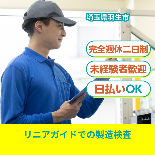 給与詳細 月収例 221,000円 時給例 1,125円 勤務地 埼玉県羽生市 仕事内容 【金属製品(リニアガイド)の製造、検査業務】