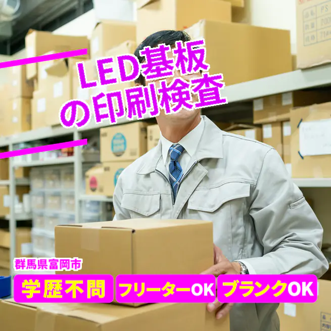 車載用LED基板の製造・検査(印刷/焼成投入回収、検査機操作/顕微鏡検査)。