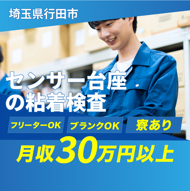 給与詳細 月収例 330,000円 日給例 11,200円 勤務地 埼玉県行田市 仕事内容 【自動車車載センサー台座の粘着加工・検査】