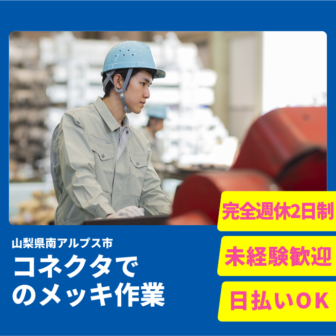 給与詳細 月収例 216,000円 日給例 10,000円 勤務地 山梨県南アルプス市 仕事内容 【コネクタ金具メッキラインオペレーター】