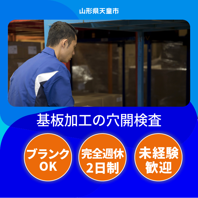 給与詳細 月収例 270,000円 日給例 10,400円 勤務地 山形県天童市 仕事内容 【基盤の製造・加工業務】
