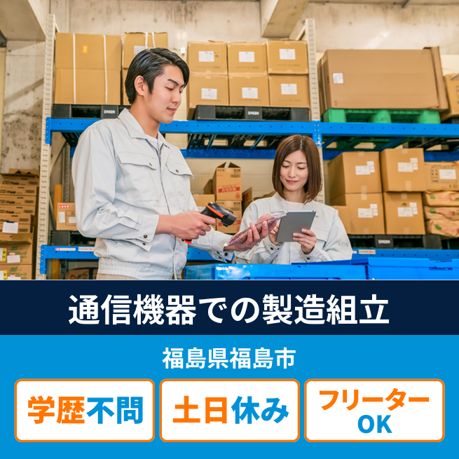 給与詳細 月収例 199,000円 時給例 1,050円 勤務地 福島県福島市 仕事内容 【通信機器製造】組立(電ドラ使用)・検査・梱包