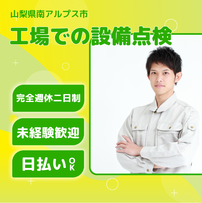給与詳細 月収例 251,000円 日給例 11,200円 勤務地 山梨県南アルプス市 仕事内容 【設備管理】
