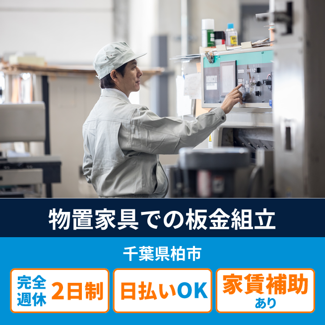 給与詳細 月収例 270,000円 日給例 11,120円 勤務地 千葉県柏市 仕事内容 スチール製品(物置・オフィス家具等)の製造(板金・塗装・組立)板金・・・プレス機での折り曲げ加工やスポット溶接機での部品・補強材取付塗装・・・天井ラインへのパーツ吊り下げや塗装機OP(色変え・清掃等)組立・・・壁・床・天井パーツのセット組やプラスチックパーツの組み付け等ライン作業