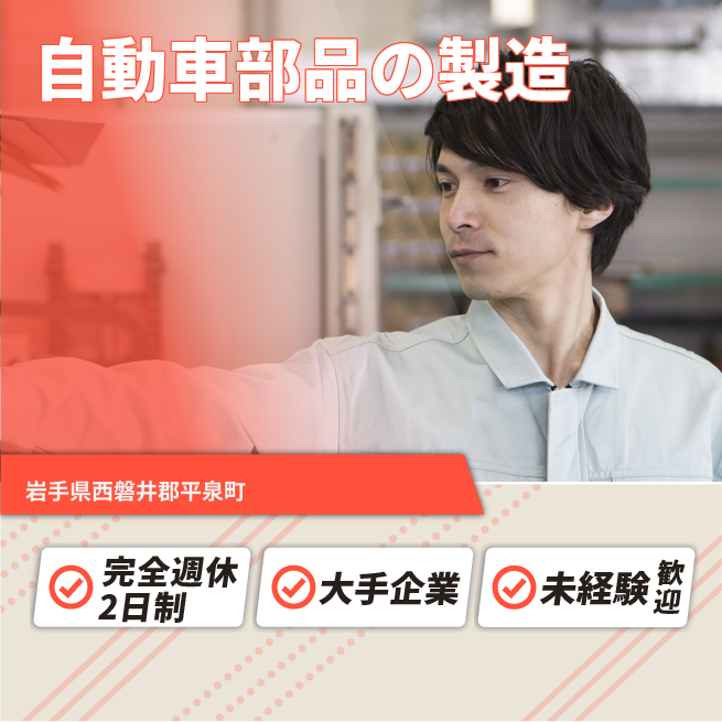 給与詳細 月収例 249,000円 日給例 10,000円 勤務地 岩手県西磐井郡平泉町 仕事内容 【自動車部品の製造(組立、加工、検査、運搬作業など)】