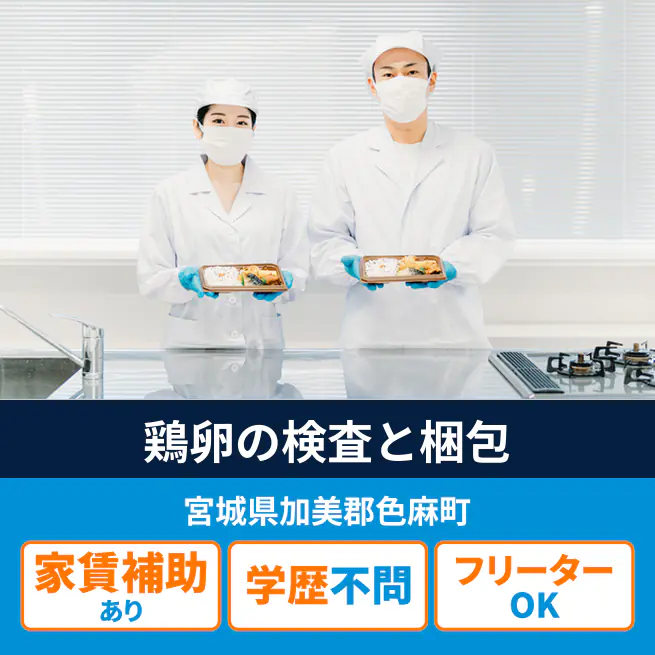 給与詳細 月収例 238,000円 日給例 10,000円 勤務地 宮城県加美郡色麻町 仕事内容 【鶏卵の検査・梱包作業】