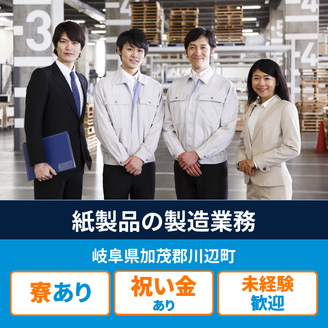 給与詳細 月収例 192,000円 時給例 1,200円 勤務地 岐阜県加茂郡川辺町 仕事内容 紙製品の製造オペレーター