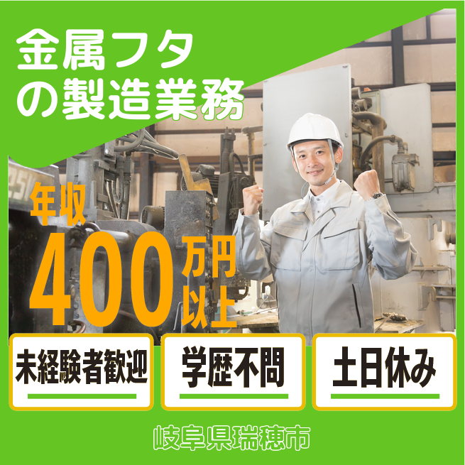 給与詳細 年収例 2,400,000円 日給例 10,000円 勤務地 岐阜県瑞穂市 仕事内容 道路に使われる金属のフタの製造