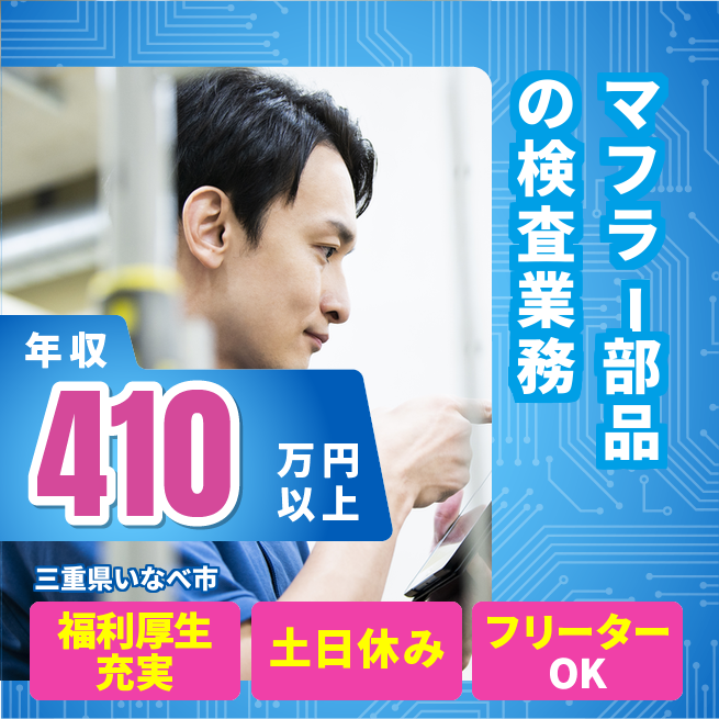 給与詳細 年収例 2,496,000円 日給例 10,400円 勤務地 三重県いなべ市 仕事内容 マフラー製造工場の製品検査
