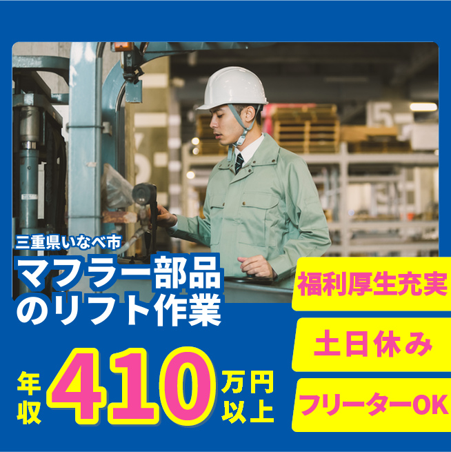 給与詳細 年収例 2,496,000円 日給例 10,400円 勤務地 三重県いなべ市 仕事内容 マフラー製造工場のリフト業務