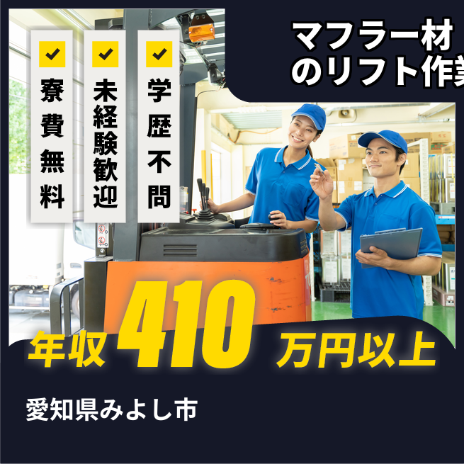 給与詳細 年収例 2,496,000円 日給例 10,400円 勤務地 愛知県みよし市 仕事内容 マフラー製造工場のリフト業務