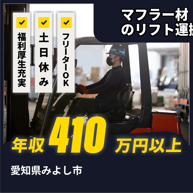 マフラー工場でのカウンターフォーク運搬。材料受取~完成品搬送・回収まで担当(未経験歓迎)。
