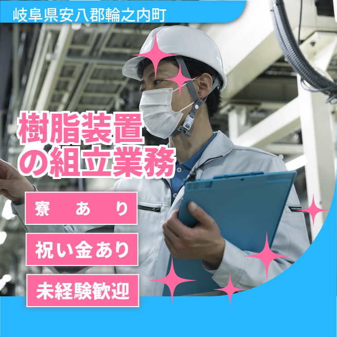 給与詳細 月収例 187,000円 時給例 1,169円 勤務地 岐阜県安八郡輪之内町 仕事内容 樹脂製造装置の組立作業