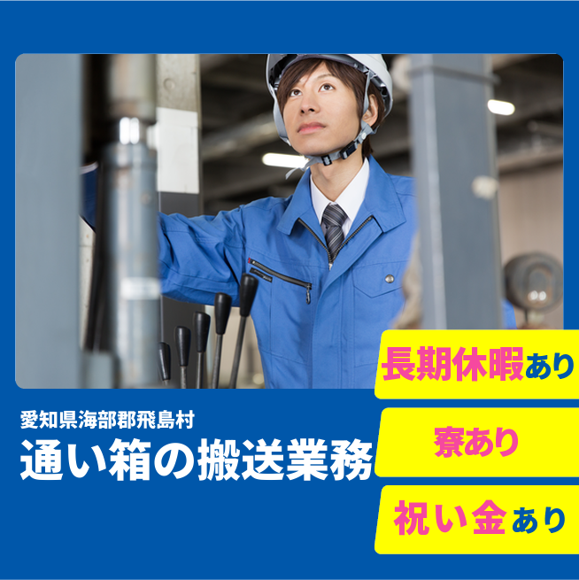 給与詳細 月収例 196,000円 時給例 1,225円 勤務地 愛知県海部郡飛島村 仕事内容 通い箱(ケース)の搬送業務