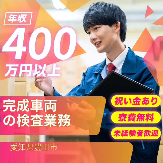 給与詳細 年収例 4,050,000円 日給例 12,335円 勤務地 愛知県豊田市 仕事内容 完成した自動車の検査業務