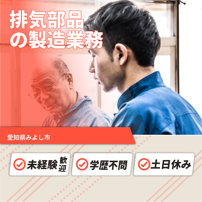 給与詳細 月収例 210,000円 日給例 10,500円 勤務地 愛知県みよし市 仕事内容 マフラー製造工場の機械オペレーター