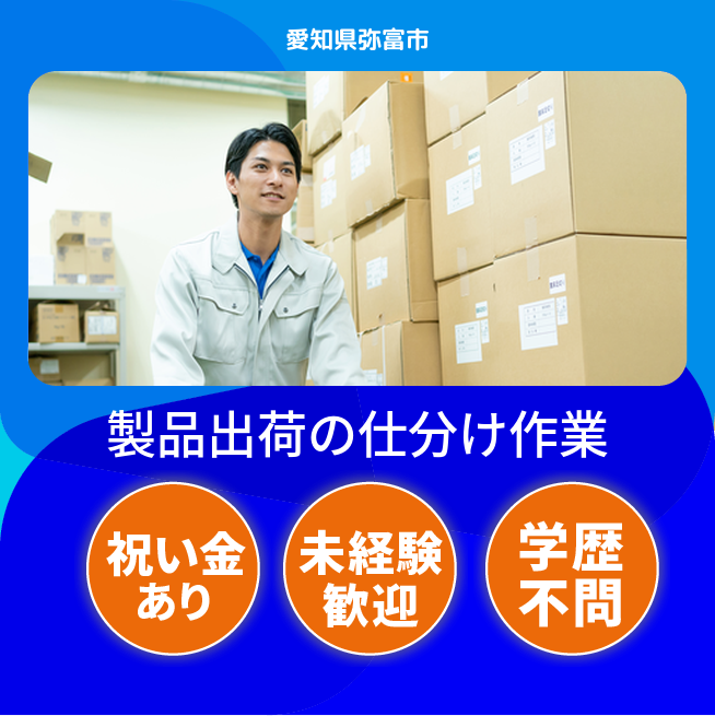 給与詳細 月収例 223,000円 日給例 11,150円 勤務地 愛知県弥富市 仕事内容 製品の出荷・仕分け・ピッキング