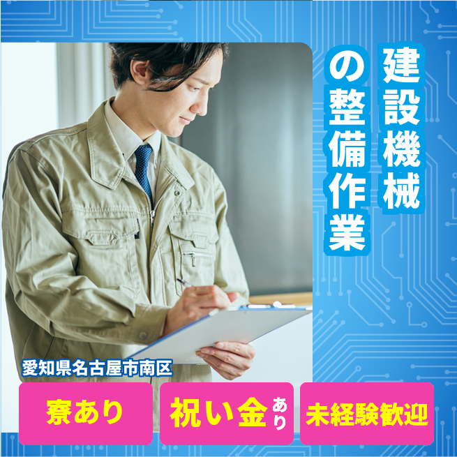 給与詳細 月収例 241,920円 日給例 12,096円 勤務地 愛知県名古屋市南区 仕事内容 建設機械の整備・点検・修理作業