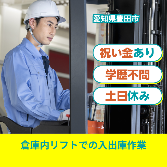 自動車部品倉庫でのフォーク業務(9割)+軽作業(1割)を担当します。