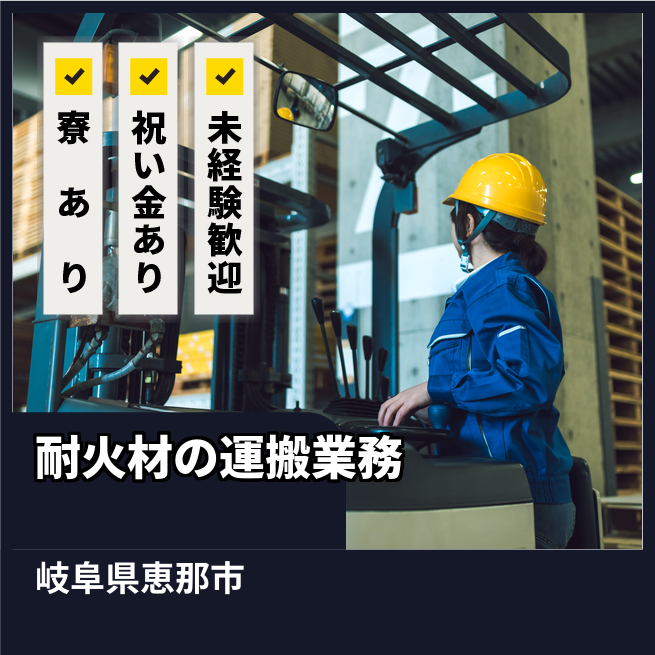 給与詳細 月収例 193,200円 時給例 1,208円 勤務地 岐阜県恵那市 仕事内容 耐火物工場での原材料の運搬・投入作業