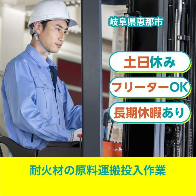 耐火物工場で原料配合・運搬・機械投入の作業。フォーク・玉掛け・クレーンは見習いから開始可。