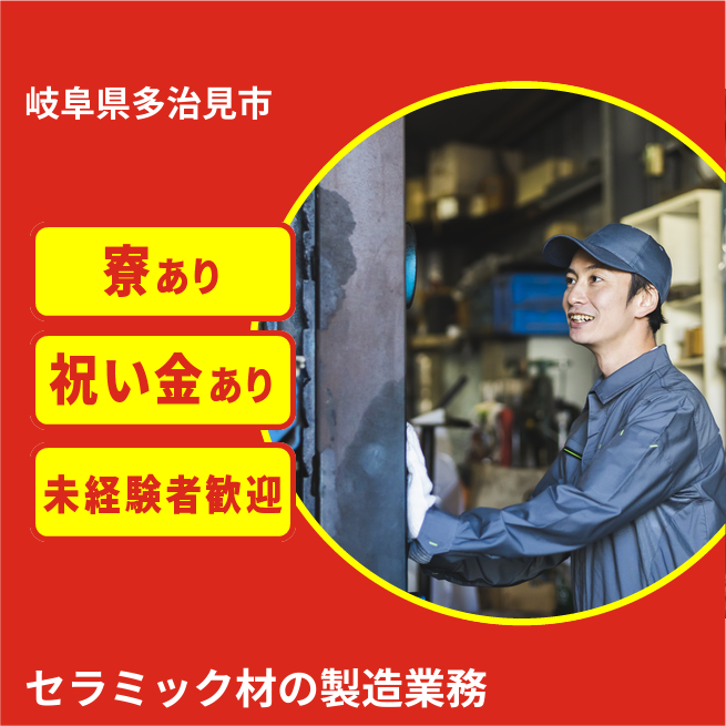 給与詳細 月収例 212,000円 日給例 10,600円 勤務地 岐阜県多治見市 仕事内容 半導体製造装置用セラミック製造
