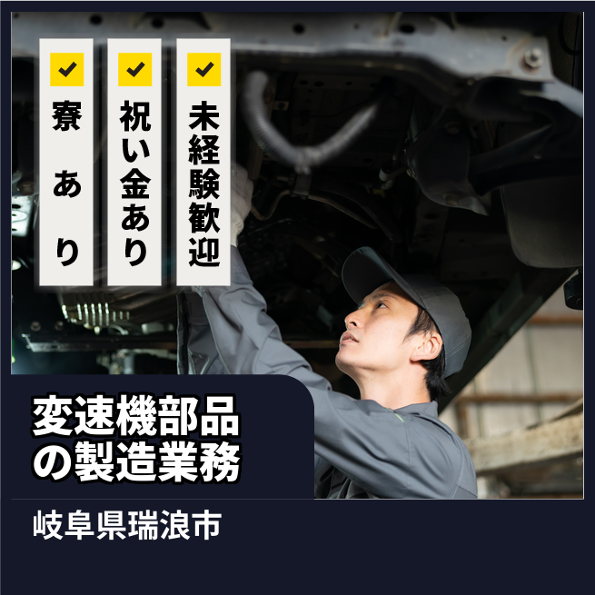 給与詳細 月収例 213,000円 日給例 10,650円 勤務地 岐阜県瑞浪市 仕事内容 オートマチックトランスミッションの製造業務