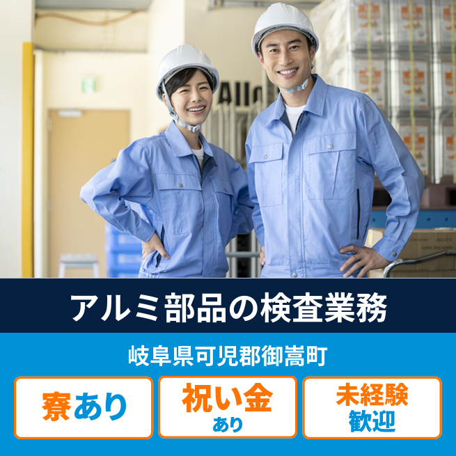 給与詳細 月収例 195,000円 時給例 1,219円 勤務地 岐阜県可児郡御嵩町 仕事内容 アルミ部品のバリ取り・目視検査・梱包