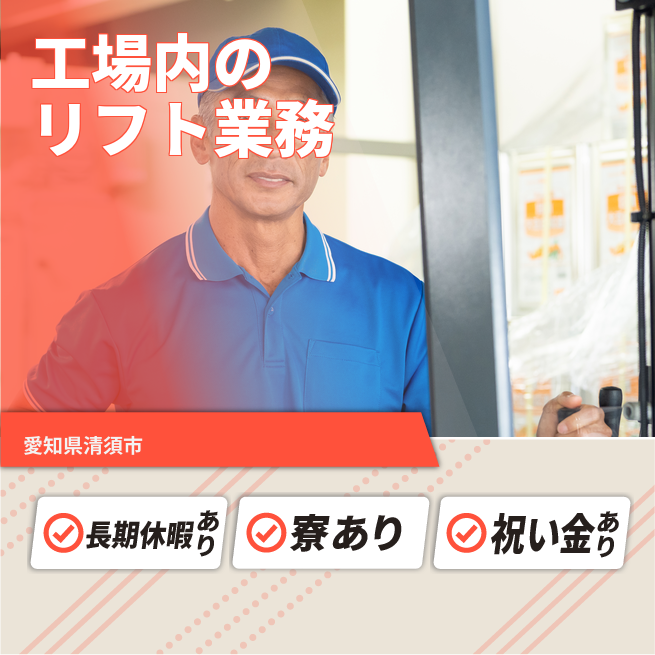 給与詳細 月収例 218,000円 日給例 10,900円 勤務地 愛知県清須市 仕事内容 製造工場内でのリフト作業
