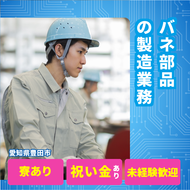 給与詳細 月収例 205,000円 日給例 10,250円 勤務地 愛知県豊田市 仕事内容 自動車部品(バネ)の製造業務