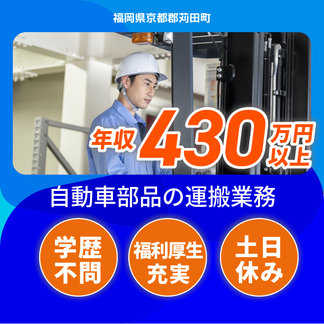 給与詳細 年収例 4,320,000円 日給例 12,250円 勤務地 福岡県京都郡苅田町 仕事内容 自動車製造に関わるリフトでの運搬業務