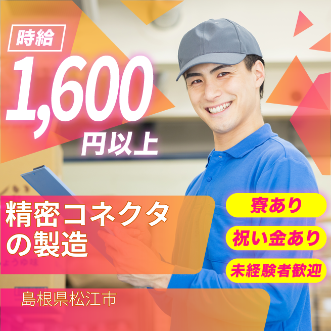 給与詳細 年収例 4,272,000円 月収例 356,000円 勤務地 島根県松江市 仕事内容 精密コネクタの各量産工程(成形、組立、プレス、メッキなど)