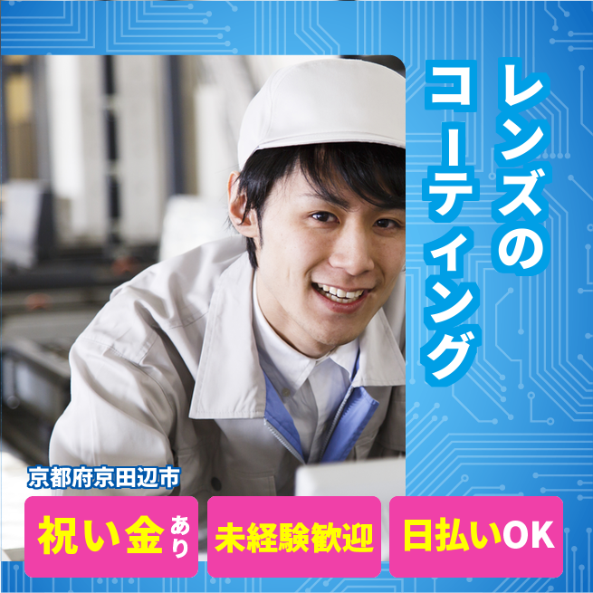 給与詳細 月収例 291,977円 日給例 10,827円 勤務地 京都府京田辺市 仕事内容 非球面レンズの蒸着(コーティング)