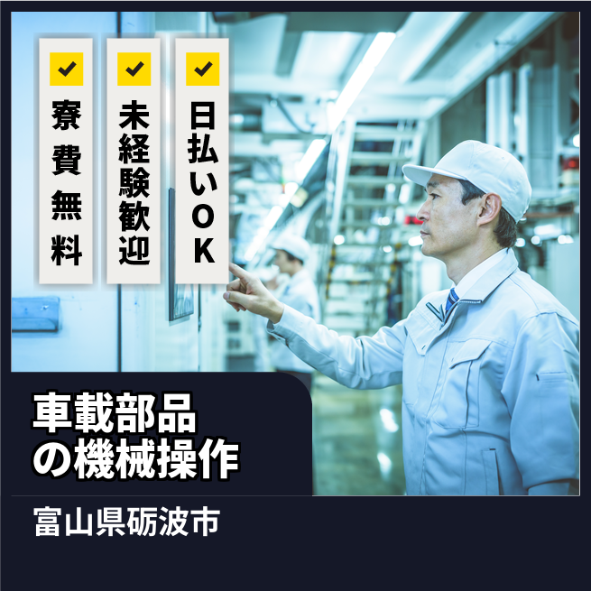 給与詳細 月収例 308,518円 日給例 11,200円 勤務地 富山県砺波市 仕事内容 車載用電子部品の製造マシンオペレーター