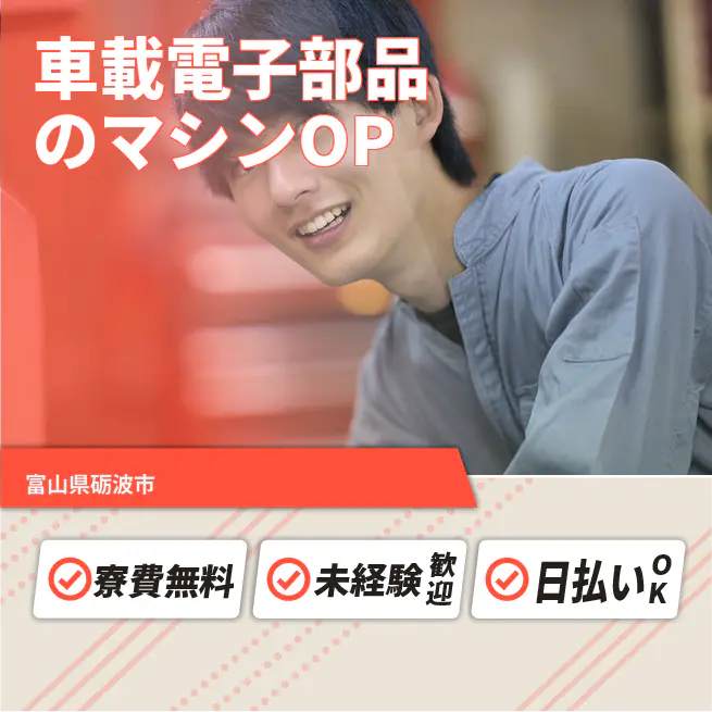 タイミングにもよりますが、入社後2~3週間後での支給が最短になってしまいます。 交通費 支給あり 応募の流れ 本ページ内<応募する>ボタンより、必要項目をご入力の上、ご応募ください。 勤務地 【勤務地】富山県砺波市宮丸 勤務時間 【勤務地】①08:30~17:00
