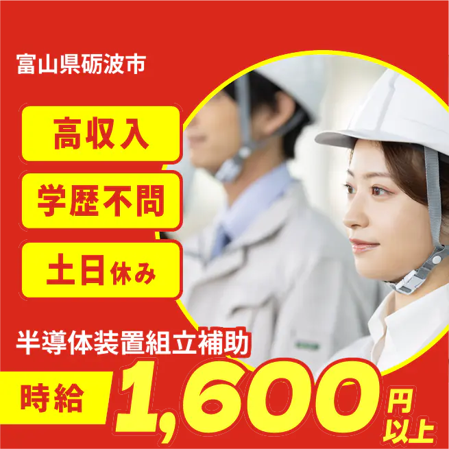 女性の場合:組立作業経験必須(ドライバーやトルクレンチ・六角レンチなどの工具経験、又は配線(束ねる、処理)などの経験必須) 福利厚生 通勤手当:上限15万円/月 ※規定あり 寮の有無:ワンルーム寮完備