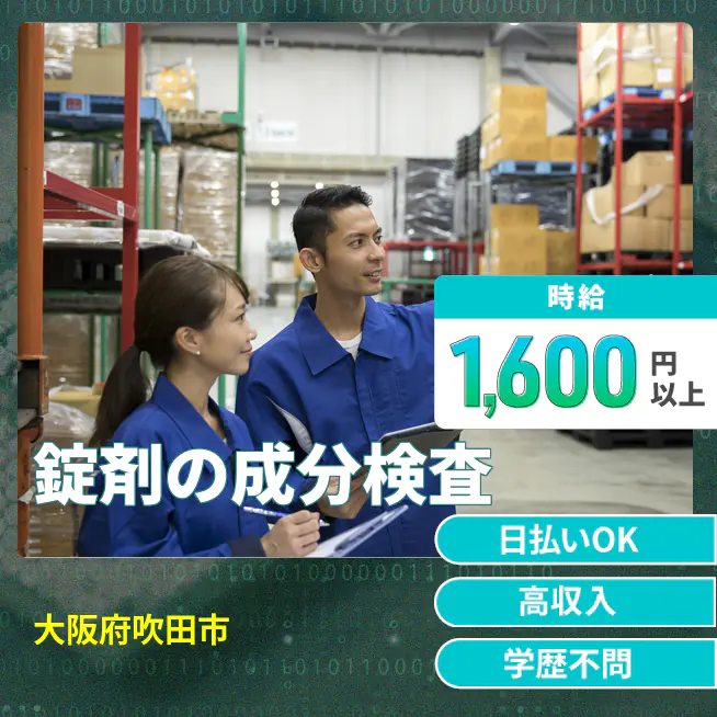 給与詳細 月収例 242,000円 日給例 12,100円 勤務地 大阪府吹田市 仕事内容 製品・原料の検査