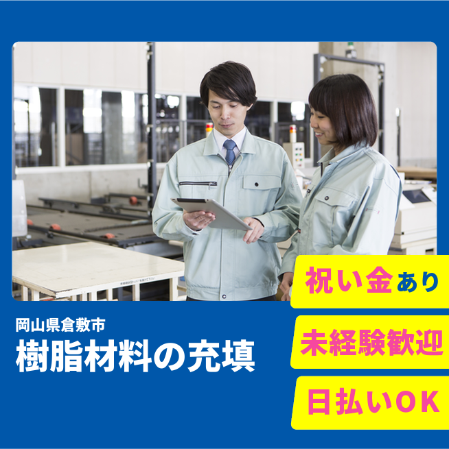 給与詳細 月収例 227,494円 日給例 10,400円 勤務地 岡山県倉敷市 仕事内容 樹脂原料(ペレット)のフレコン充填包装