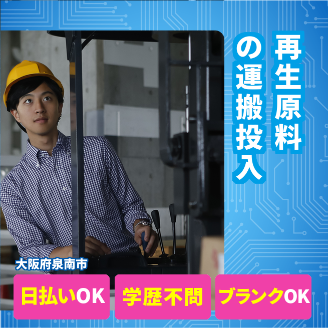 ペットボトル再生ペレットの原料運搬・投入・マシンオペ・梱包・日常点検(屋内外)。