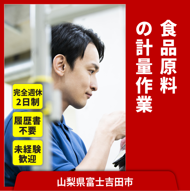 給与詳細 月収例 243,750円 日給例 10,000円 勤務地 山梨県富士吉田市 仕事内容 食品原料の測定・計量のため袋に小分けにする