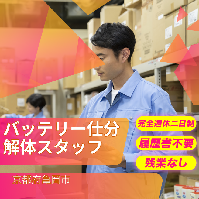 給与詳細 年収例 4,095,000円 月収例 341,250円 勤務地 京都府亀岡市 仕事内容 【バッテリー仕分解体スタッフ】